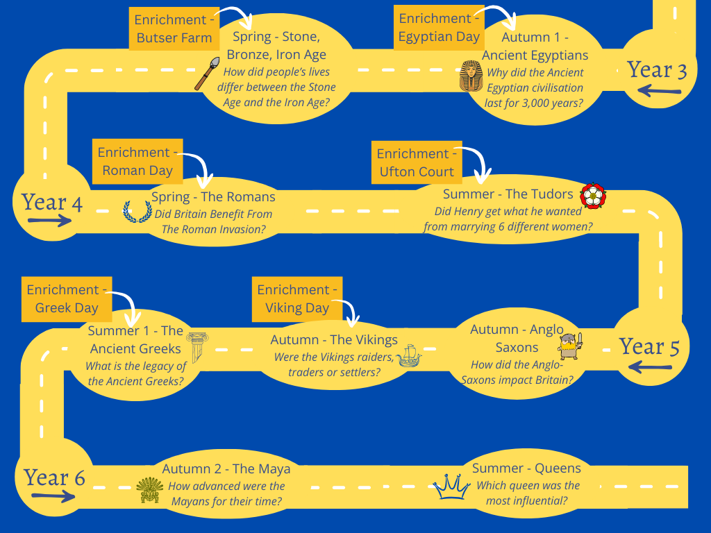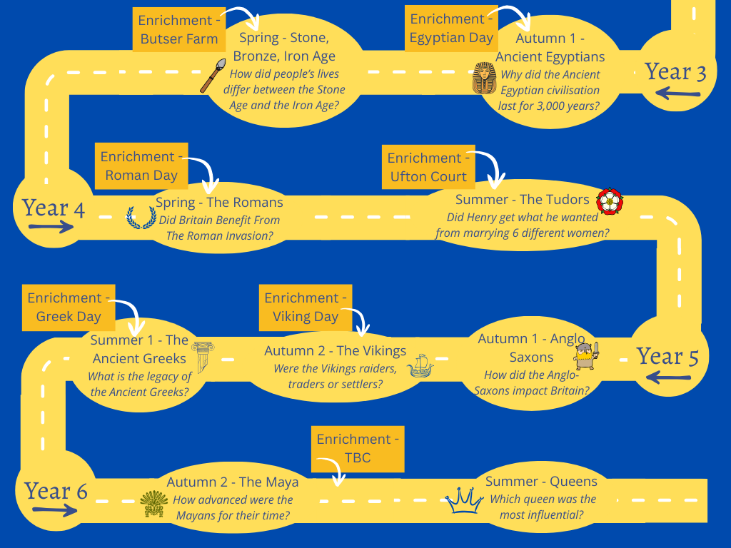 We aim to enable the children to be active participants in history by exposing them to areas of the past that will particularly capture their imagination, either because of a local link, or because of their significance to the history of our nation or the world. Studying the lives of people in the past helps develop empathy and insight. We build on key themes across the school to strengthen their understanding of concept and to build a sound knowledge base for them to build on further as they travel onwards through life.