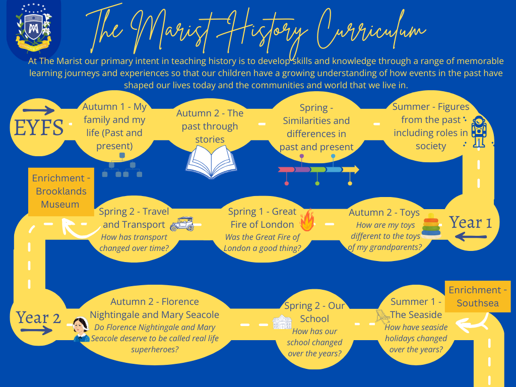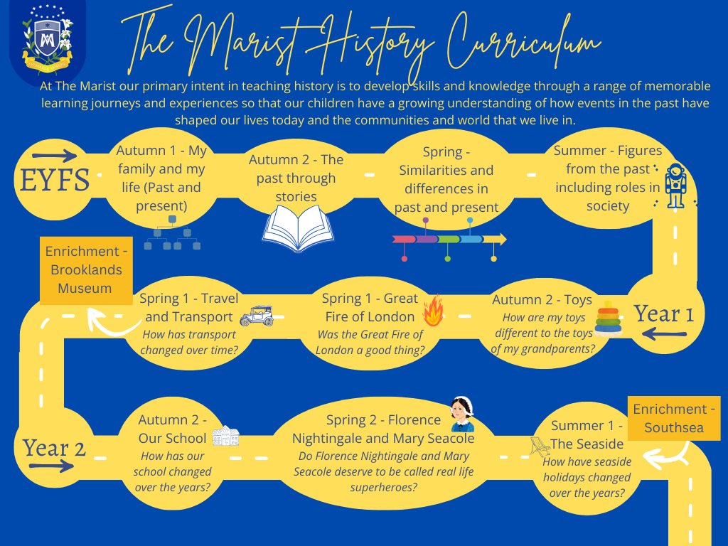 At The Marist our primary intent in teaching history is to develop skills and knowledge through a range of memorable learning journeys and experiences so that our children have a growing understanding of how events in the past have shaped our lives today and the communities and world that we live in.