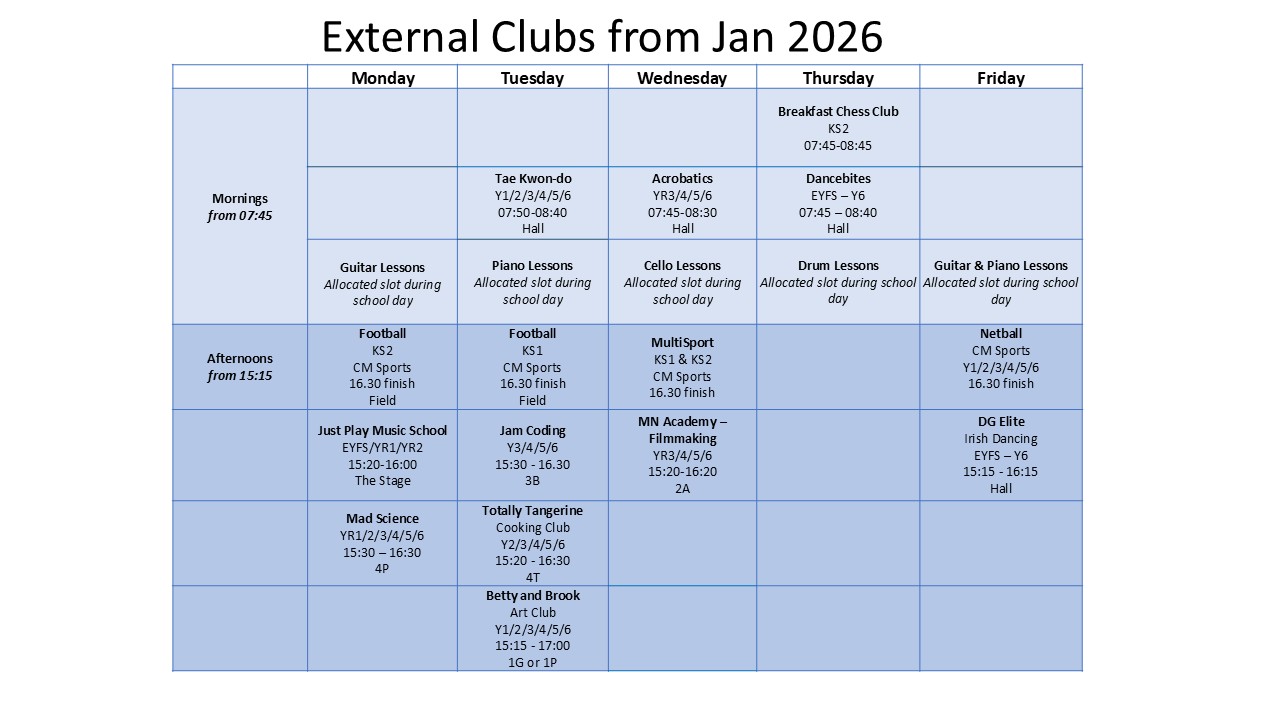 For outdoor clubs, if it is raining, an indoor space (such as a classroom or the main hall) will be made available and the activity will be adapted accordingly for the indoor space available. Should a club need to be cancelled for any reason, the club provider will contact you directly. If this is at short notice, the school office will also endeavour to telephone parents as necessary.