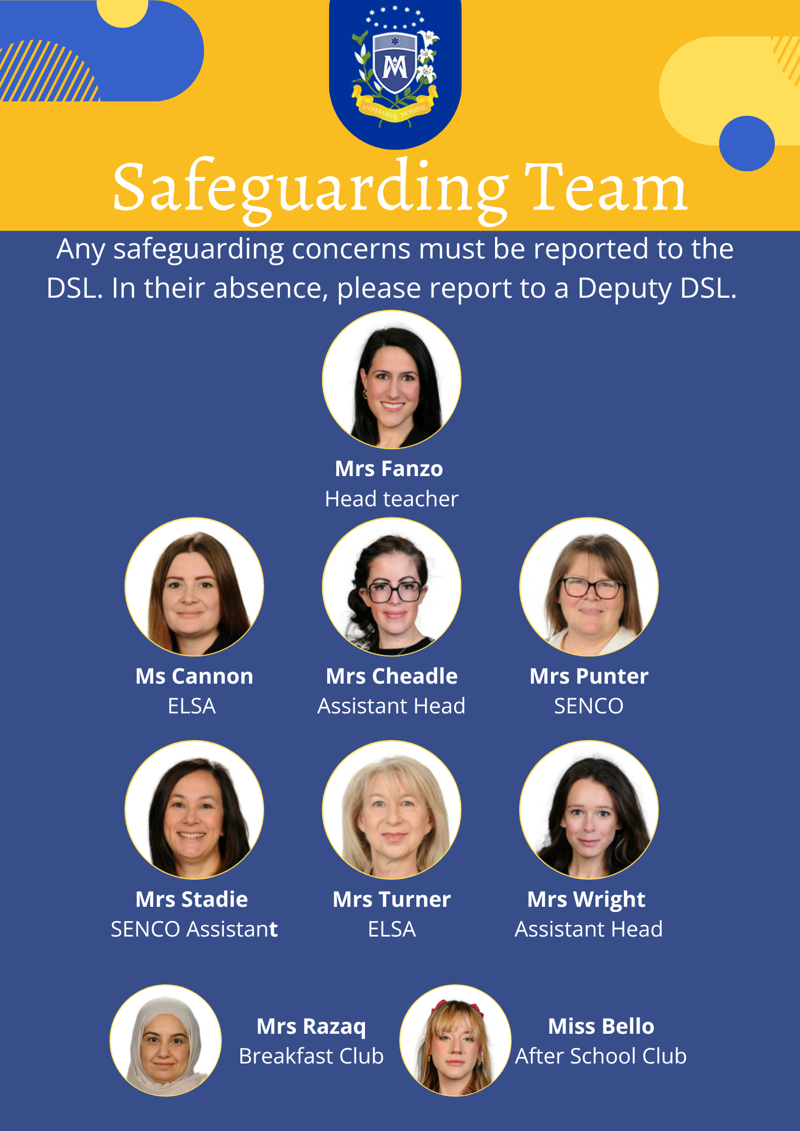 - Deputy Designated Safeguarding Lead – Anastasia Wright, Assistant Head; Megan Cheadle, Assistant Head; Bethan Punter, SENDCo; Deirdre Turner, ELSA; Jenna Canon, ELSA; Lorena Bello, Extended Schools Manager; Nusrat Razaq. Breakfast Club; Rebecca Stadie, SEND Assistant