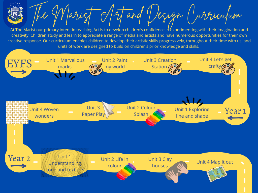 At The Marist our primary intent in teaching Art is to develop children’s confidence in experimenting with their imagination and creatvity. Children study and learn to appreciate a range of media and artists and have numerous opportunities for their own creative response. Our curriculum enables children to develop their artistic skills progressively, throughout their time with us, and units of work are designed to build on children’s prior knowledge and skills.