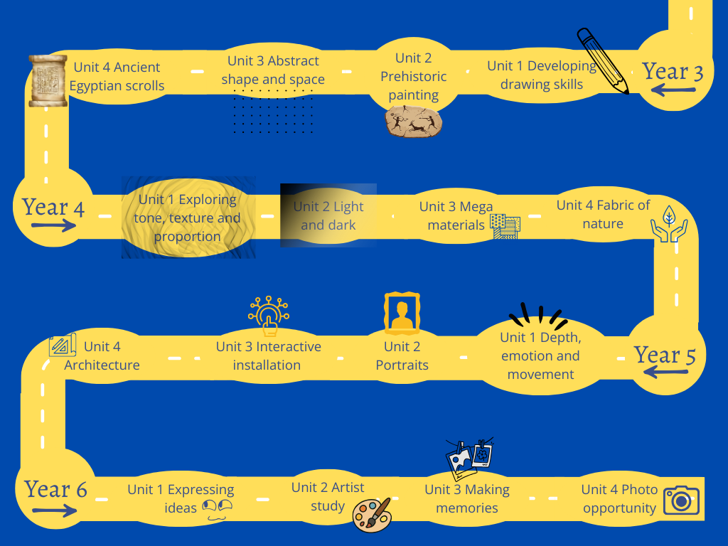 Children in Key Stage 1 are taught a range of foundational skills and techniques, with studies of artwork and artists linked to their wider curriculum themes. Children in Key Stage 2 are introduced to more complex skills, techniques and artistic movements, with a ‘Foundation Year’ in Year 3 and then working on a three year rolling programme. Children are supported in developing their knowledge and understanding of influential artists within specific art movements and links are made to prior and further learning, often chronologically. The appreciation of and opportunities to respond to various artists and works of art is embedded within the spiritual life of the school and throughout our wider curriculum, for example in RE, History and English. Links are made to the wider social, cultural and historical context of the artistic movements and the diverse range of artists studied supports children in developing their understanding of a diverse global society.