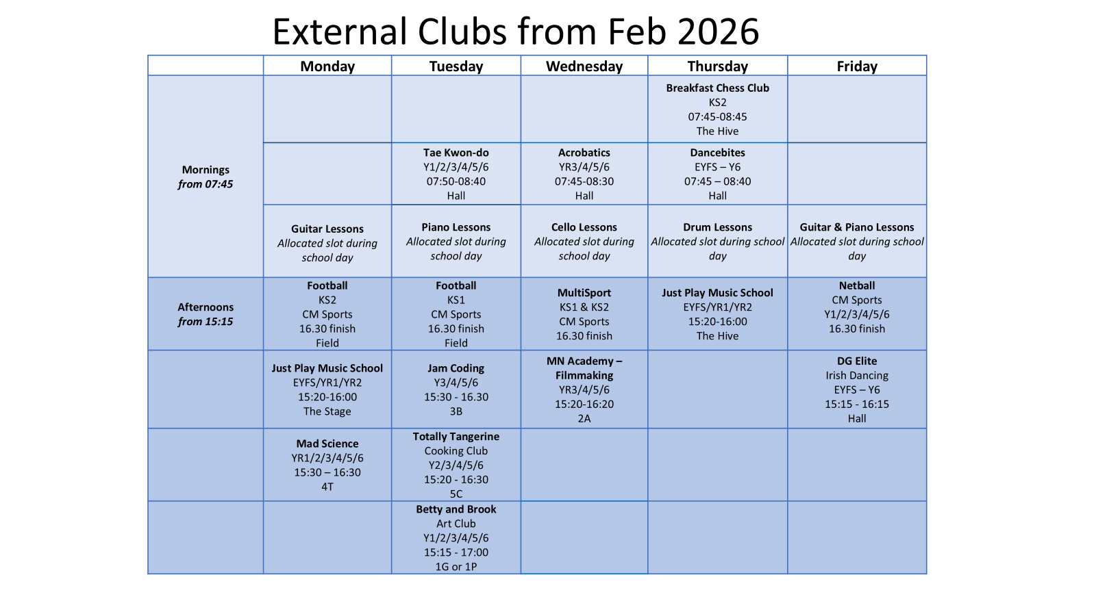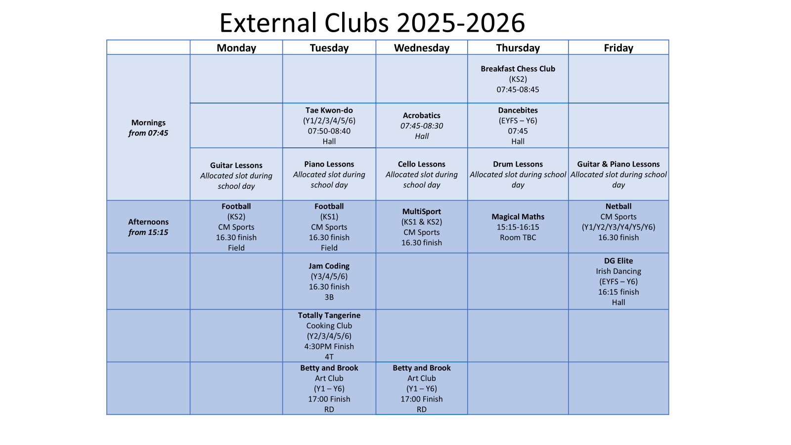 For outdoor clubs, if it is raining, an indoor space (such as a classroom or the main hall) will be made available and the activity will be adapted accordingly for the indoor space available. Should a club need to be cancelled for any reason, the club provider will contact you directly. If this is at short notice, the school office will also endeavour to telephone parents as necessary.