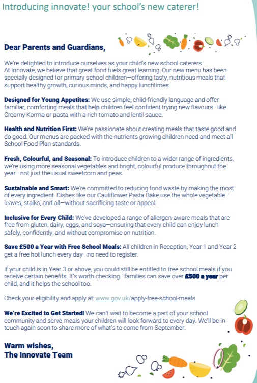 We are excited to share some important news regarding our school catering services. From 1st September 2025, our in-school catering will be provided by Innovate.